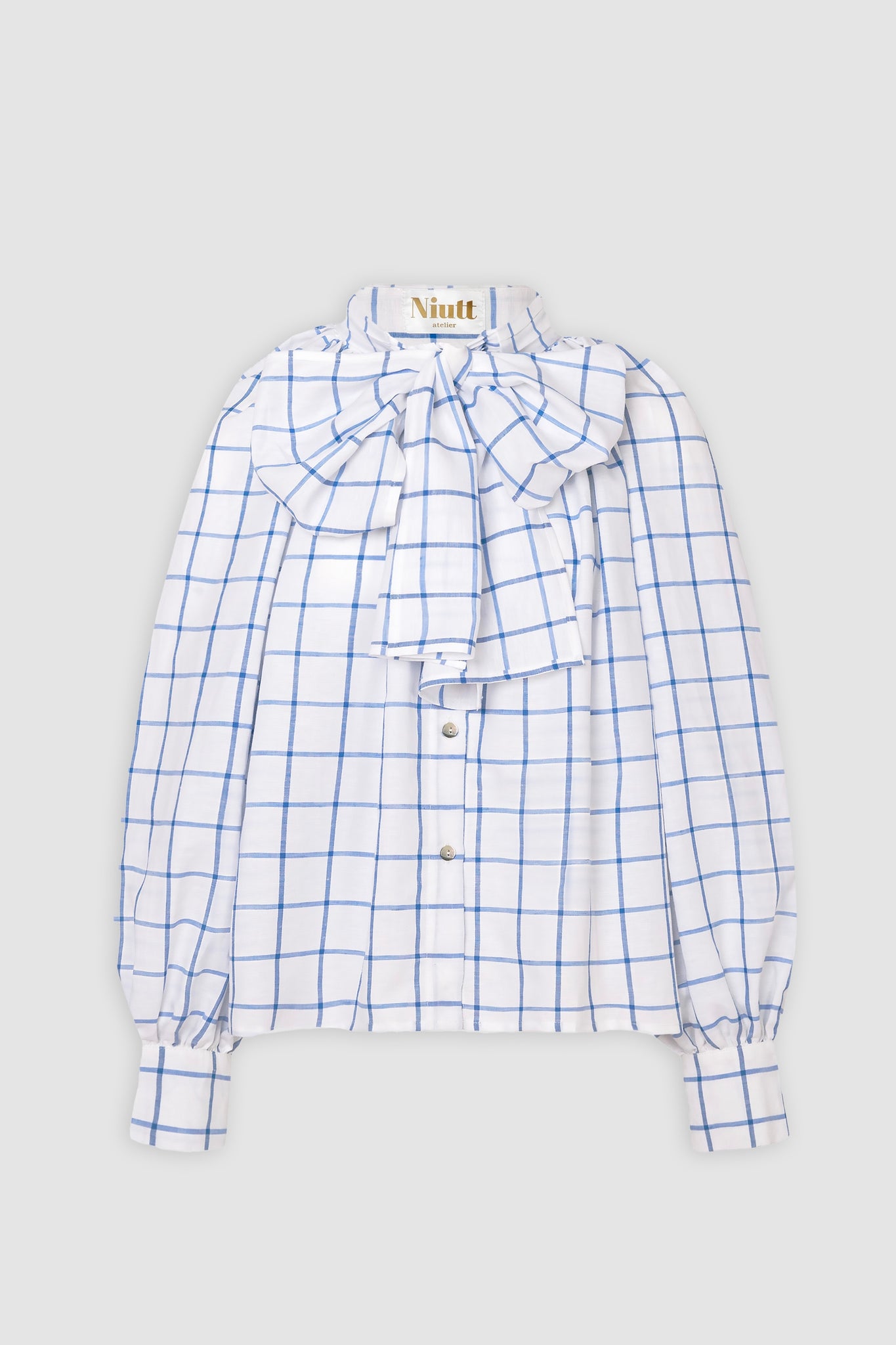Camisa abotonada blanca con cuadros azules, lazo delantero y manga abullonada.