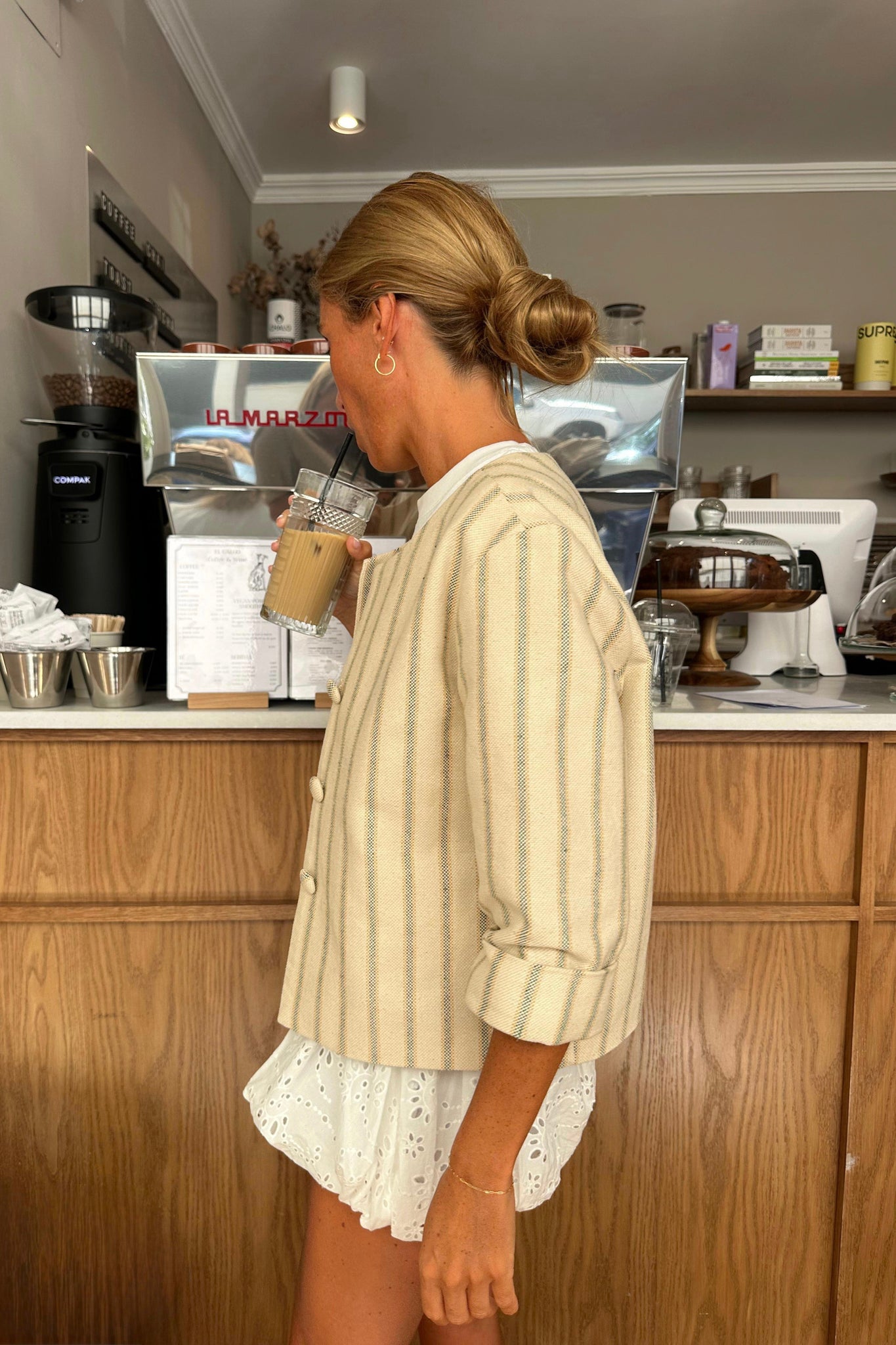 Chaqueta beige con rayas en tonos verdes y amarillos, manga francesa, botones forrados en la parte delantera y forro interior en color verde.