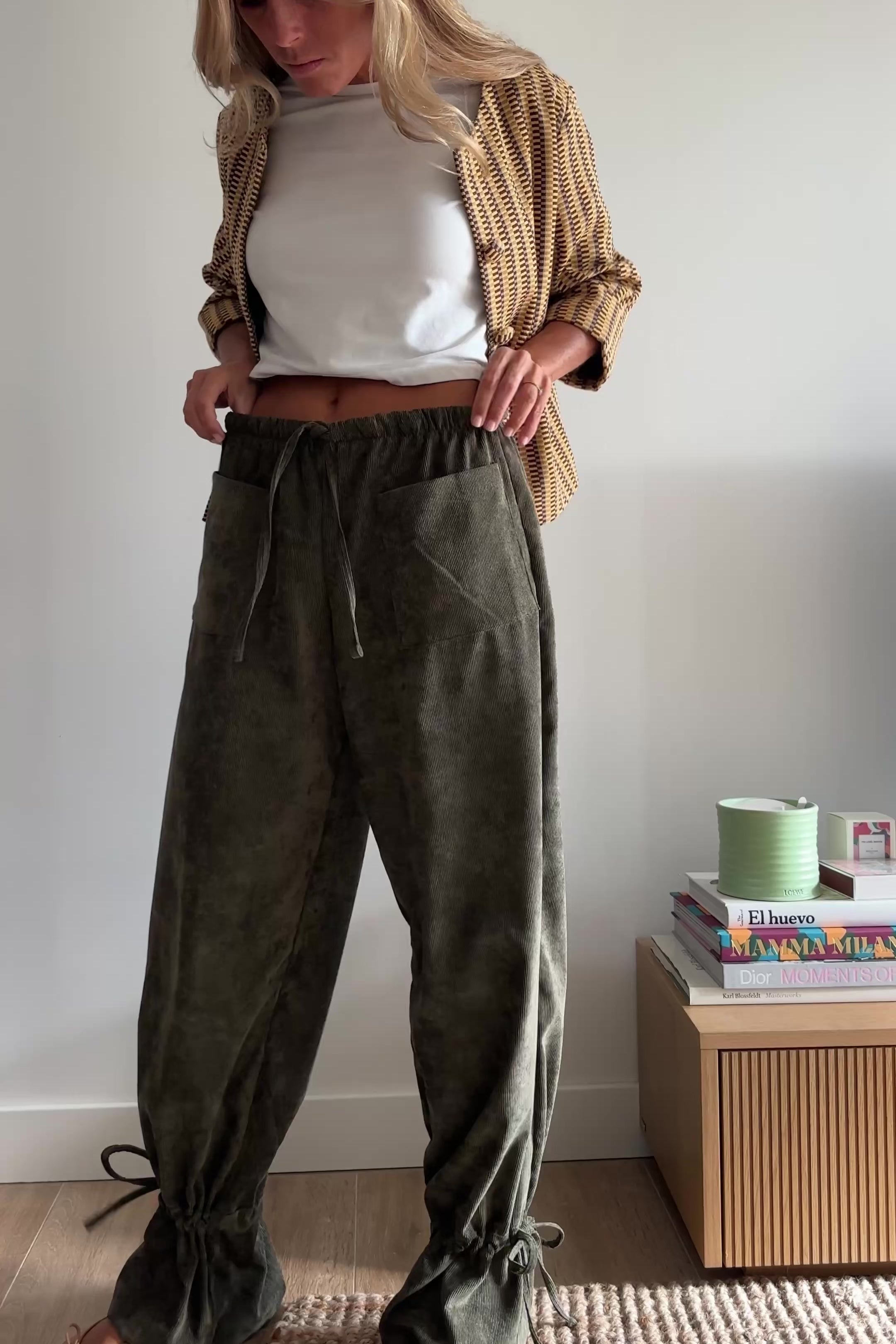 Pantalón de micropana verde caqui, largo de rayas, bolsillos delanteros, cintura con goma y cinturón ajustable. En la parte inferior puedes ajustar el lazo a tu gusto para darle ese efecto balloon o bien llevarlos rectos.
